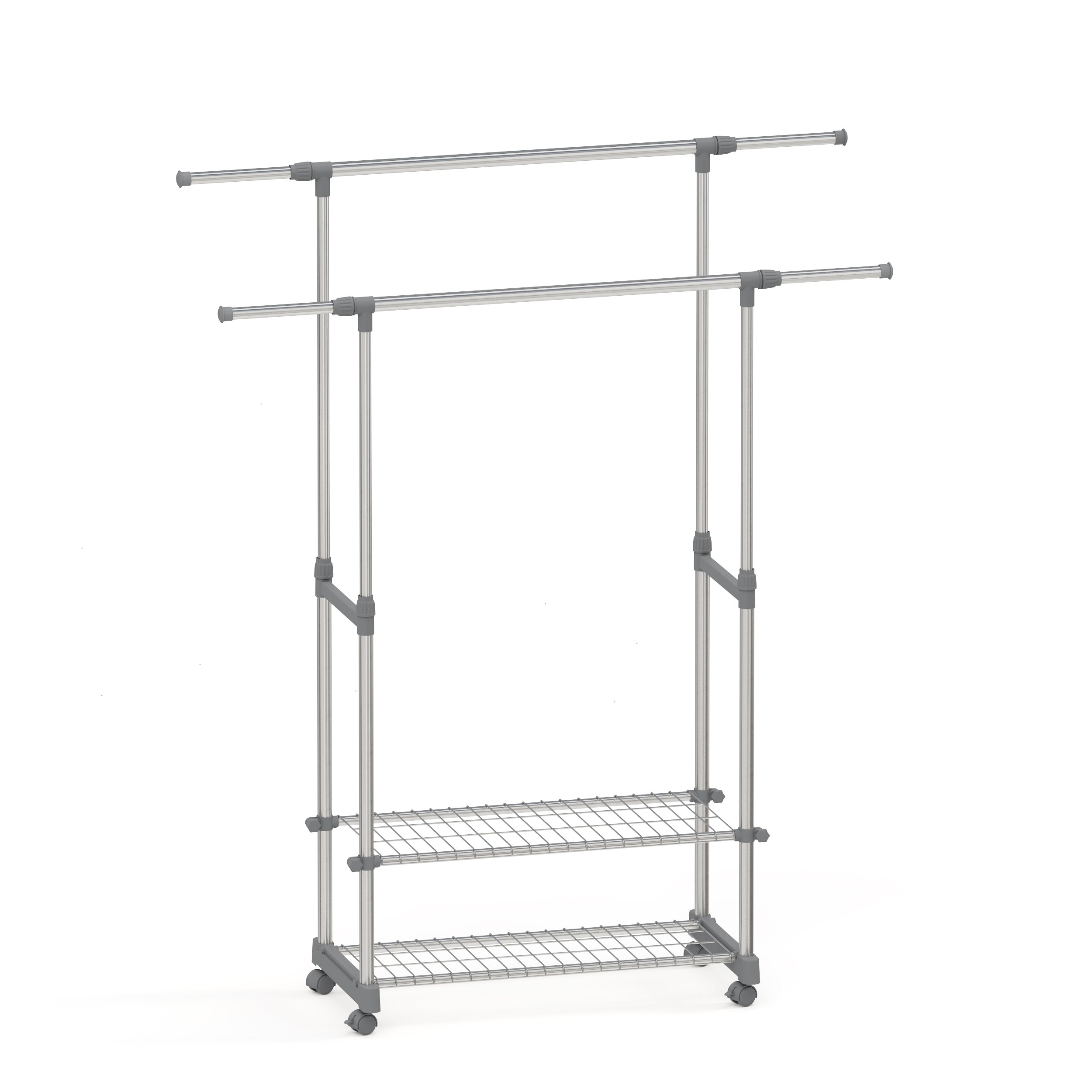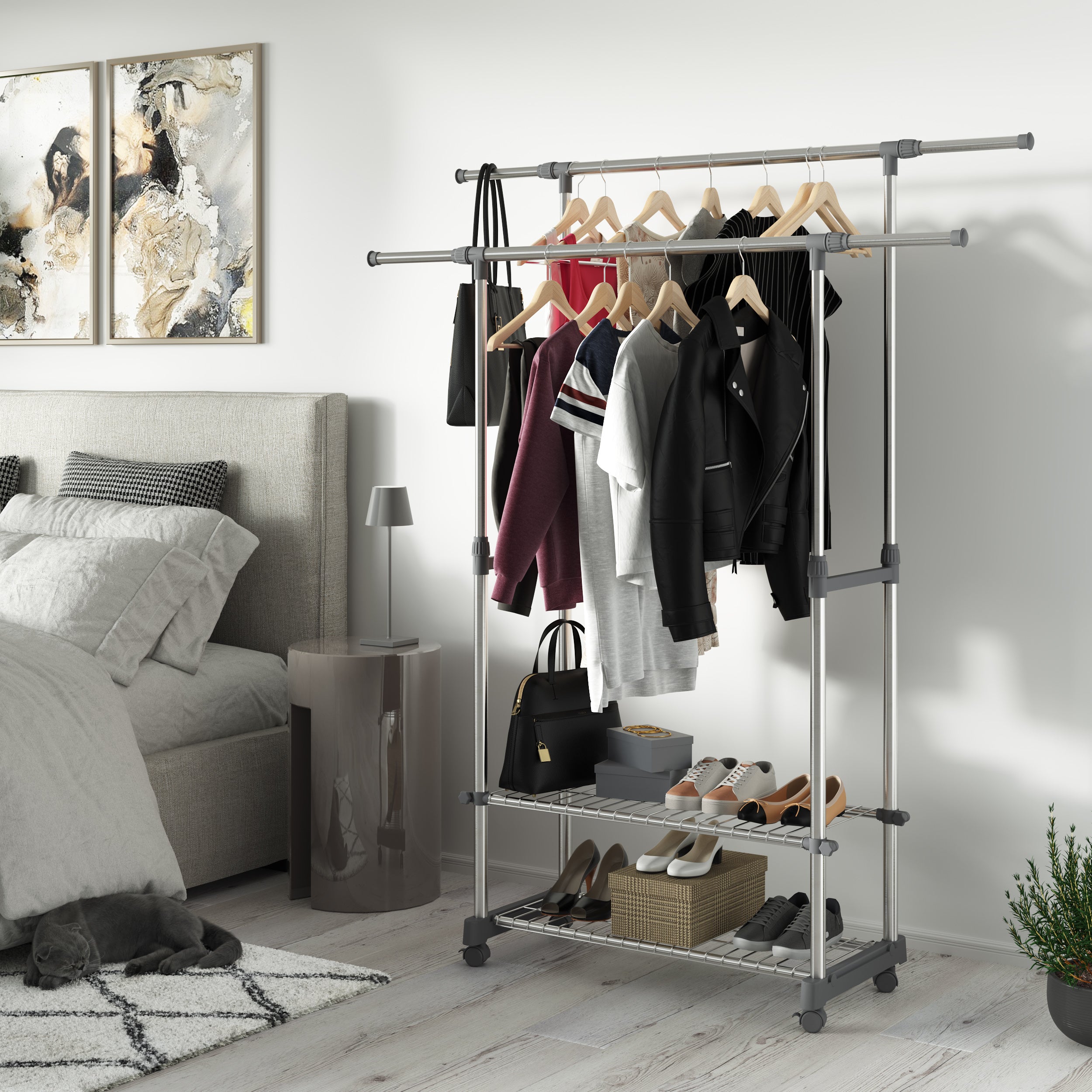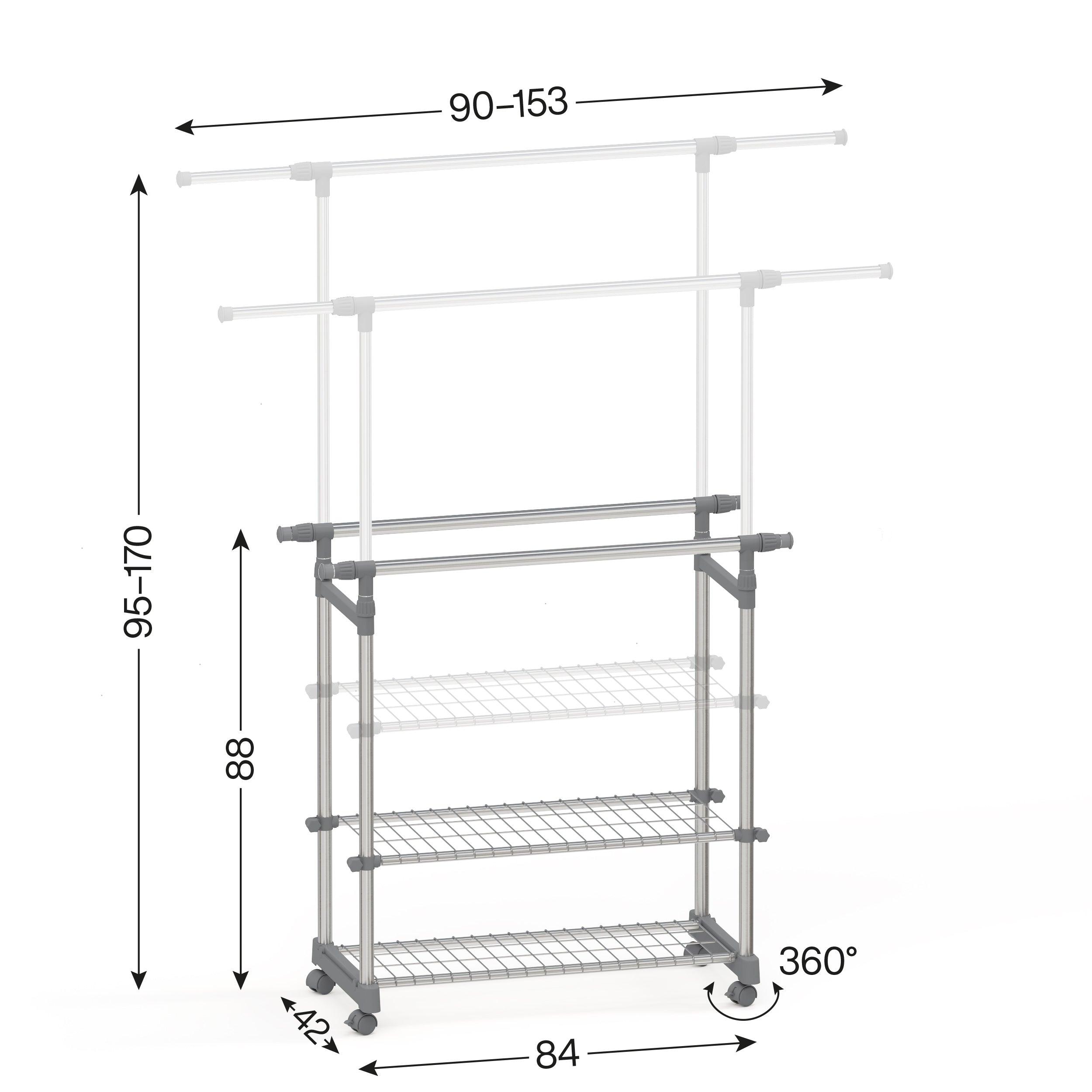 - Außergewöhnlich variabel: Der Multifunktion-Garderobenständer auf 4 robusten Rollen, die um 360° drehbar sind, ermöglichen ein sanftes Gleiten. 2 Rollen mit Bremsen gewährleisten eine zusätzliche Stabilität, auch im beladenen Zustand. Sie können jede freie Ecke als Kleiderschrank oder Wäscheständer / Wäschetrockner verwenden und faltenfrei Ihre Kleider verstauen oder trocknen lassen.