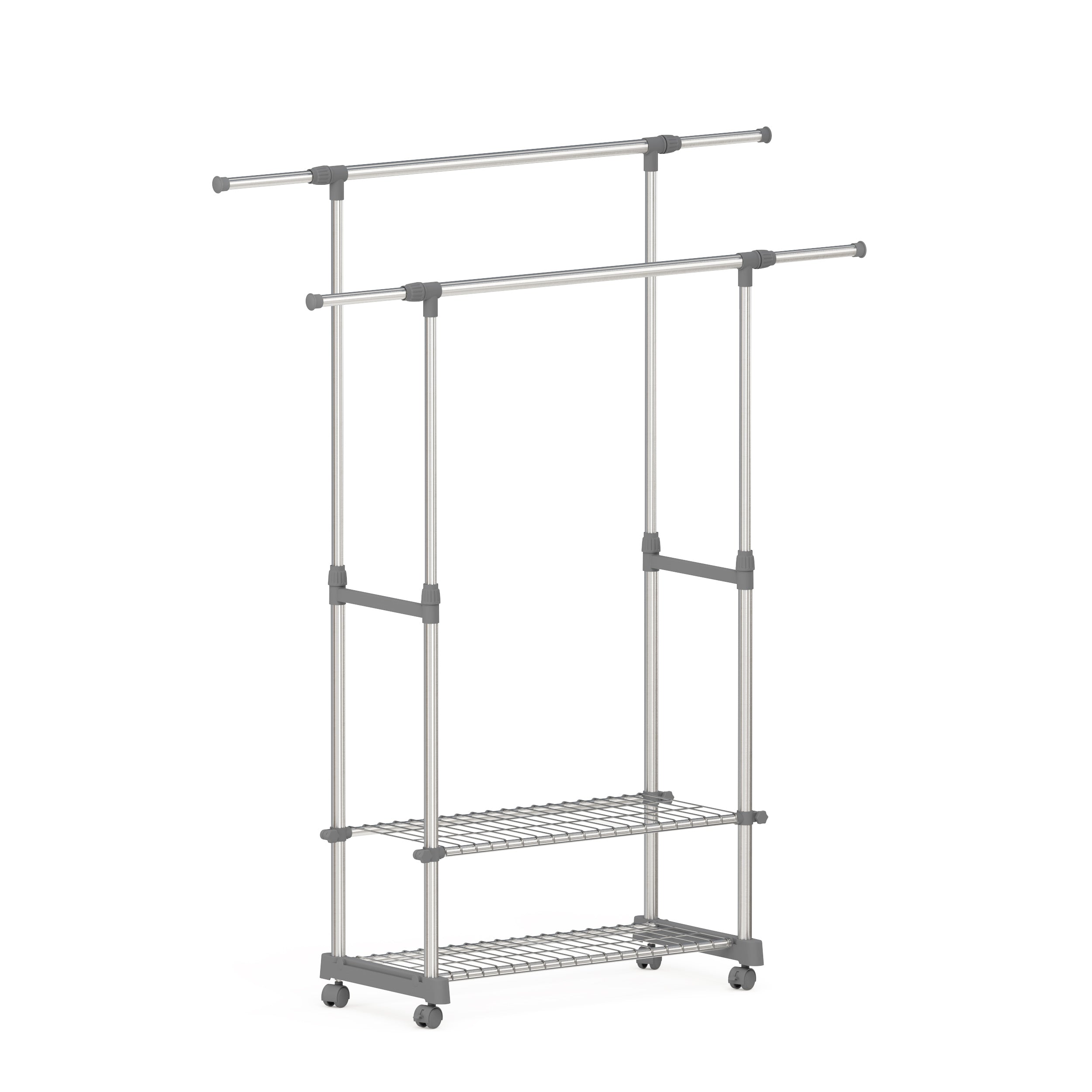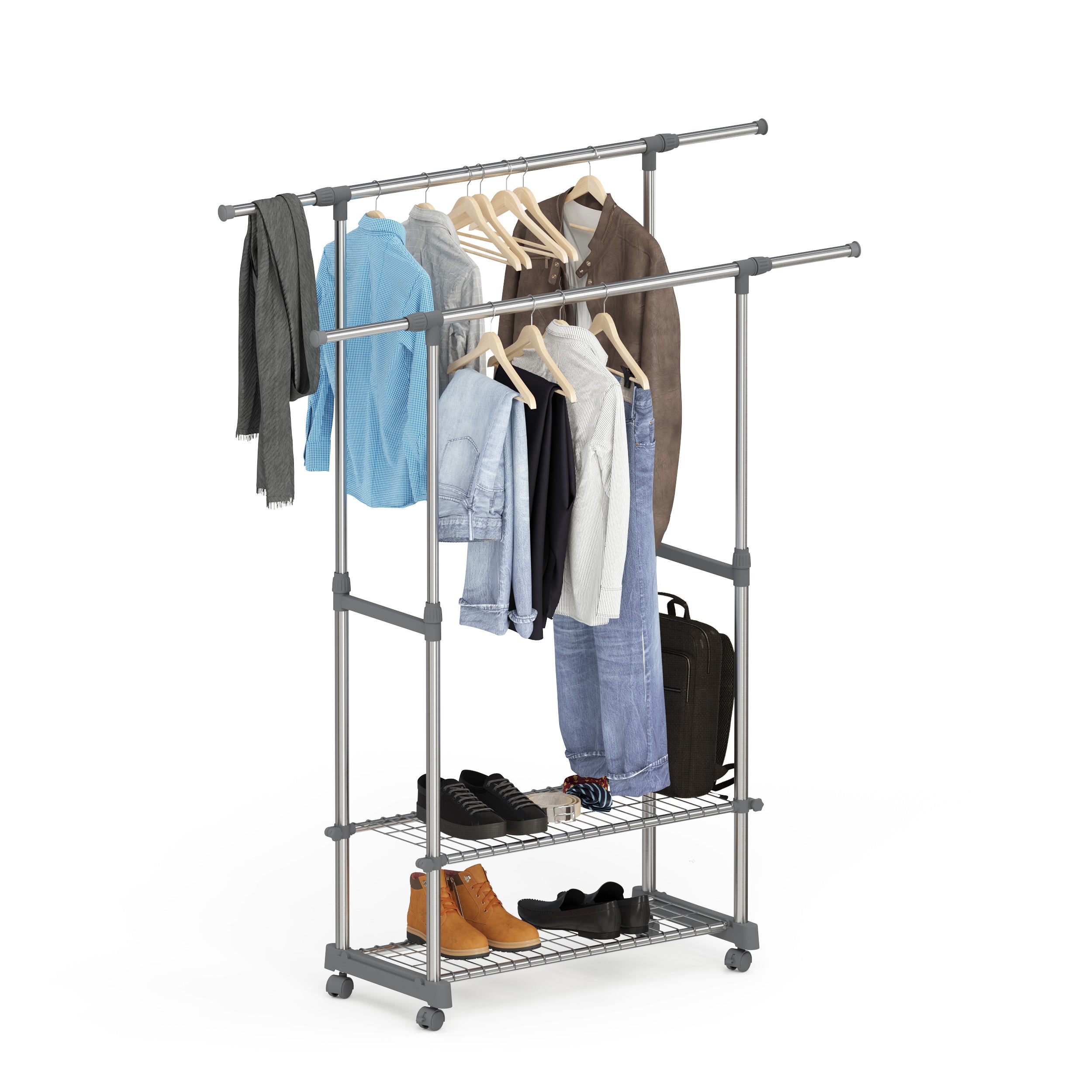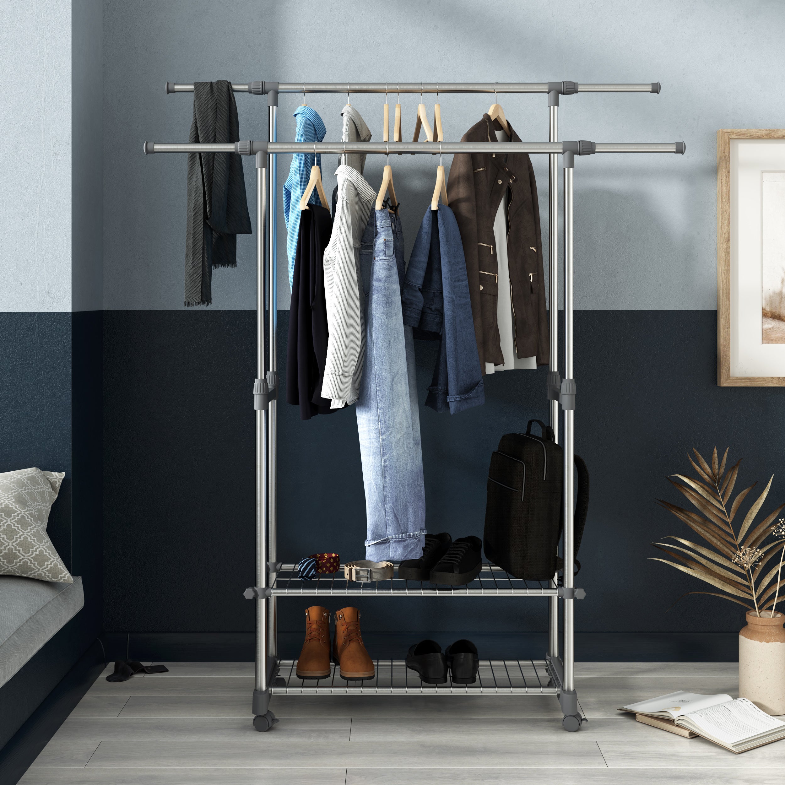 - Außergewöhnlich variabel: Der Multifunktion-Garderobenständer auf 4 robusten Rollen, die um 360° drehbar sind, ermöglichen ein sanftes Gleiten. 2 Rollen mit Bremsen gewährleisten eine zusätzliche Stabilität, auch im beladenen Zustand. Sie können jede freie Ecke als Kleiderschrank oder Wäscheständer / Wäschetrockner verwenden und faltenfrei Ihre Kleider verstauen oder trocknen lassen.